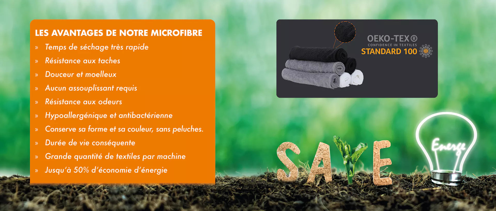 Notre microfibre est à 100% composée d’un polyester d’une finesse microscopique. La texture de la microfibre diffère totalement du coton, de petits crochets s’étendent depuis le cœur de la fibre et retiennent l’eau ou toute autre substance. Cette composition compacte crée un tissu d’un moelleux incomparable. La douceur de la microfibre contribuera grandement au bien-être de vos clients.Une serviette en microfibre est bien plus douce qu’un classique tissu éponge ou qu’une serviette en coton. De plus, le volume d’une serviette en microfibre est moindre, ce qui vous permet d’en placer un plus grand nombre dans la machine à laver, économisant ainsi en détergent, en eau, en temps, et en argent. Les serviettes en microfibres étant plus lisses que les serviettes classiques, elles ne nécessitent pas d’assouplissant. Contrairement au coton, l’eau ne s’incruste pas dans la fibre mais reste prise entre les crochets, ce qui signifie que la microfibre est extrêmement résistante aux huiles, agents de blanchiment, et autres substances. En outre, la fibre constitue un tissu dense, elle ne forme pas de peluches susceptibles de bloquer votre machine. Enfin, les serviettes en microfibre ont une durée de vie supérieure à la moyenne, elles conservent leur couleur et leur forme, même après de nombreux lavages. Elles sont également hypoallergéniques, antibactériennes, et anti-odeurs ; en d'autres termes, parfaitement adaptées aux peaux sensibles. Après lavage, le temps de séchage très court vous permettra de réaliser de précieuses économies de temps et d’énergie.